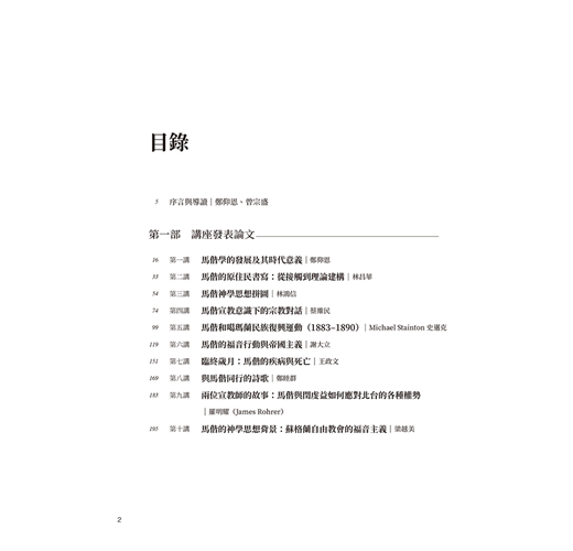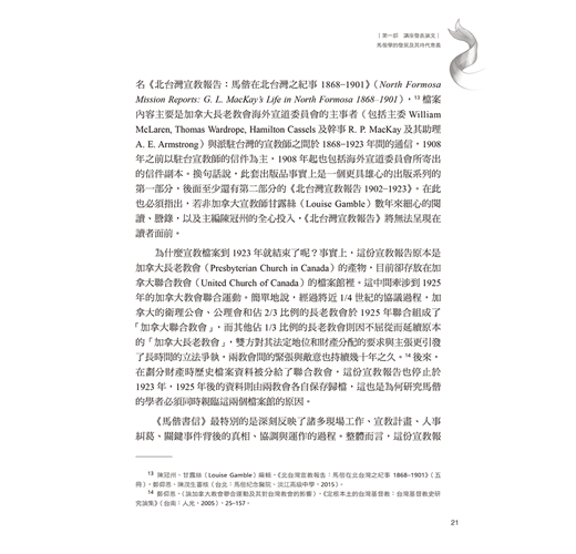 本書論文從神學思想、宣教官與實踐、與原住民族關係、生平記事與遍對環境變局、還有詩歌聖詩等不同角度探討馬偕豐富的遺產,主題內容多樣而豐富,包括〈馬偕學的發展及其時代意義〉、〈馬偕的原住民書寫〉、〈馬偕神學思想拼圖〉、〈馬偕宣教意識下的宗教對話〉、〈馬偕和噶瑪蘭民族復興運動〉、〈馬偕的福音行動與帝國主義〉、〈臨終歲月:馬偕的疾病與死亡〉、〈與馬偕同行的詩歌〉、〈兩位宣教師的故事:馬偕與閏虔益如何應對北台的各種權勢〉以及〈馬偕的神學思想背景:蘇格蘭自由教會的福音主義〉。
