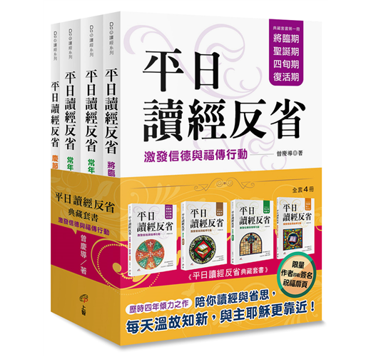 《平日讀經反省典藏套書》按照禮儀年曆的安排,分為四冊來講解平日讀經。曾慶導神父有深厚的神學涵養及聖經基礎,以流暢淺顯的文筆、溫和堅定的語氣,闡明基督信仰的真理。從靈修、教理和牧靈的角度切入,一天一篇溫暖指引,引導你靜心默想與反省平日彌撒讀經,每天重新對焦於天主。