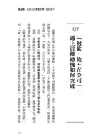 我覺得特別精彩的內容包括:年年吸引上萬人搶著上課的推廣流程、業務員的NG言行檢核表(不該做的事)、目標客戶名單必備的四大要素、約訪的三大密技、顧問式行銷的七大流程、拉近商談距離的四大步驟等。作者將業務銷售的過程,整理得清晰有邏輯,搭配深入淺出的案例說明,讓人一翻開書就欲罷不能。