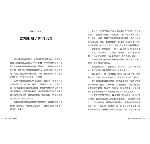 然而克雷格牧師卻在本書中,很真實、坦誠地把他內心深處的軟弱、無助、負面想法與人所擁有的罪性,絲毫不隱藏地攤在讀者面前,他跟我們一樣,每天都要面對撒旦的謊言,也會掉落牠所設下的陷阱;此外,他很直白地告訴讀者,他也接受諮商。因此,在還沒看過本書前,我以為我不是他,沒有他所擁有的那些領導魅力與特質,所以也無法像他一樣擁有這麼強大的領導力與影響力。