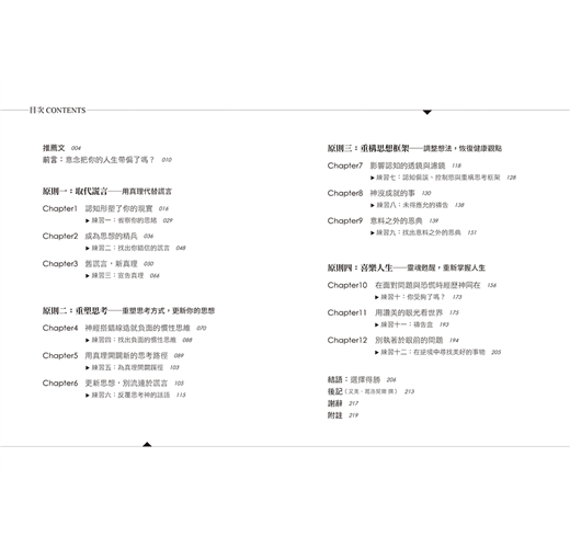 本書強調四個原則,(一)省察思緒、找出錯誤認知,再以真理來取代(二)覺察負面的慣性思維,用真理重塑(三)重構自己的思想框架,使我們的眼光恢復健康(四)用讚美的眼光看世界,重享喜樂人生。我個人認為,第三部分是最重要的轉捩點,正如作者在第九章說的:「我們該如何改變看待過去的眼光?答案是,為著神沒有在我們生命中成就的事獻上感謝,找到神良善的記號。」