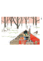 小木屋裡充滿著美好的食物香味,爸每天都到森林裡打獵;媽每天都忙著烹煮各式各樣的食物,為了即將到來的寒冬做準備。小幫手羅蘭,也在一旁幫爸撿拾燻肉用的木塊、幫媽攪拌鍋子裡的食物,忙碌的秋季就要結束了,大森林即將穿上銀白色的衣裳。