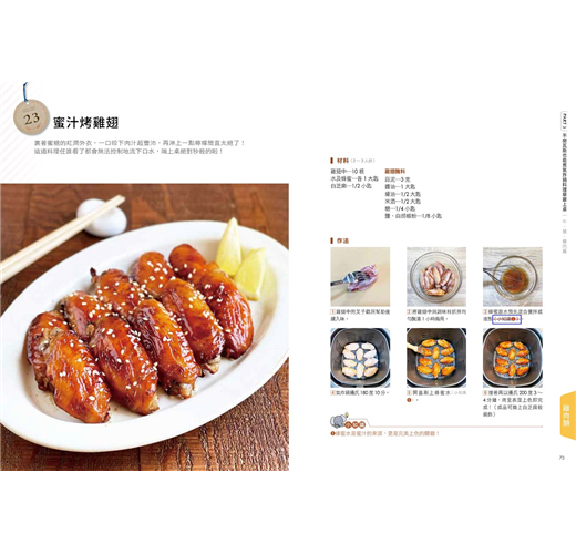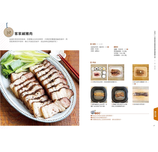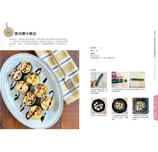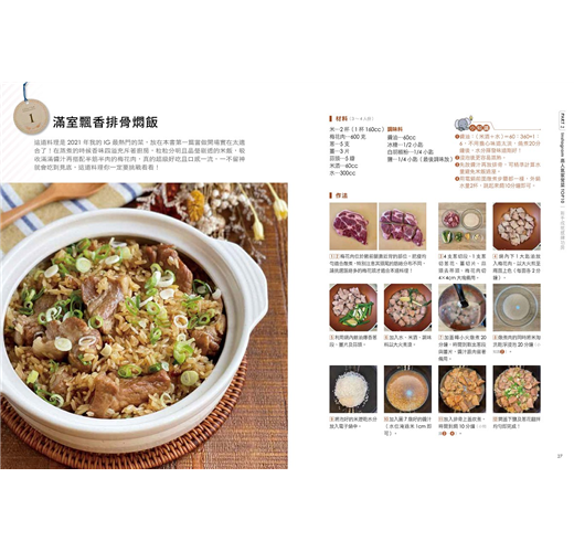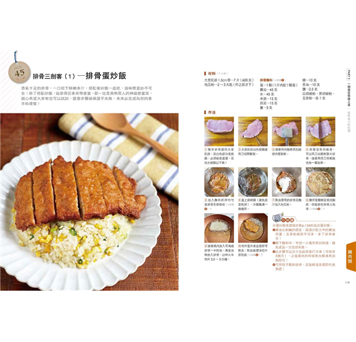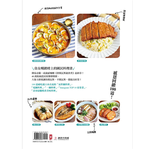 本書是以70道瓦斯爐的直火料理為主,30道氣炸鍋料理為輔,希望快速便利的氣炸鍋,能成為大家快速出餐的神兵利器!在菜單的編排上,這本書真的傾盡我所有,收錄了整整100道料理!其中不但精選Instagram發表過的經典菜色,如:「排骨燜飯」、「蛤蠣蒸蛋」及「照燒虱目魚」等料理,更有多達60道未曾公開過的食譜以饗讀者,大家可以期待一下全新的內容!