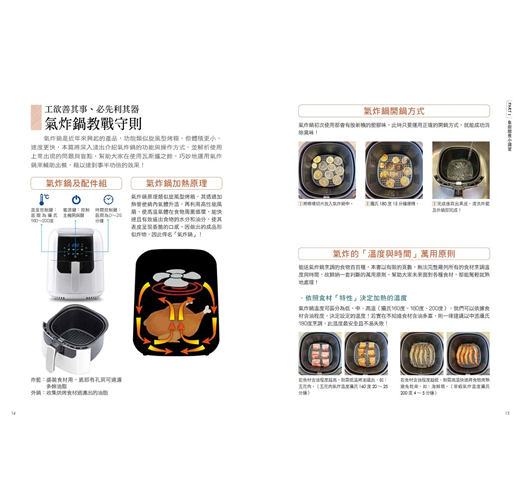 這次前導的部分,我重新檢視並更新了自己常用的調味料,希望能讓讀者透過調味,進而更瞭解這本食譜書的風味!俗話說得好:「工欲善其事、必先利其器」,因每天在網路跟讀者互動多年,發現許多人對於氣炸鍋和不沾鍋,這兩大家庭常用的工具,有著諸多一知半解的困惑,所以我特別希望利用出書的機會,針對這兩個部分寫成專題,並套入全新的設計概念,運用大量且清楚明瞭的插圖,深入淺出幫助大家將觀念釐清,希望每個人從這本書開始,學會如何充分利用工具,而不是被工具所奴役!
