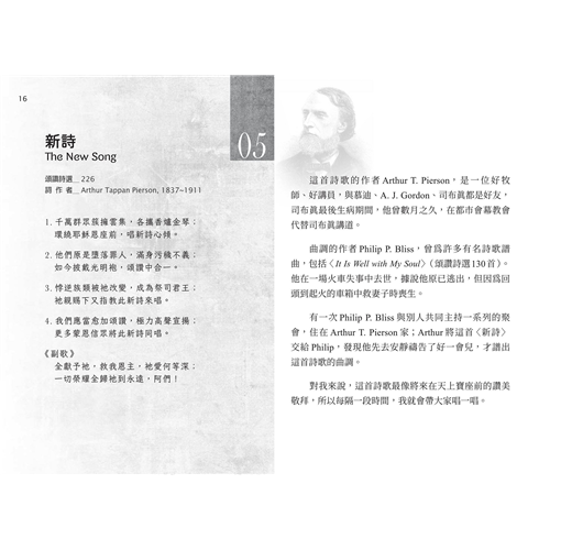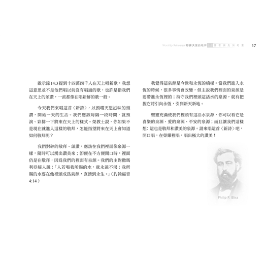 今天我們來唱這首〈新詩〉,以預嚐天恩滋味的頌讚,開始一天的生活。我們應該每隔一段時間,就預演、彩排一下將來在天上的樣式。榮教士說,你如果不是現在就進入這樣的敬拜,怎能指望將來在天上會知道如何敬拜呢?