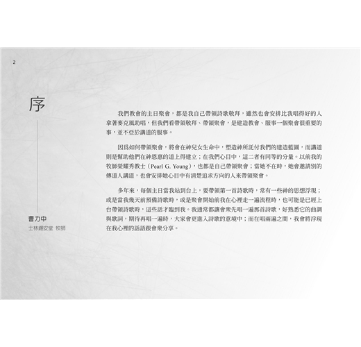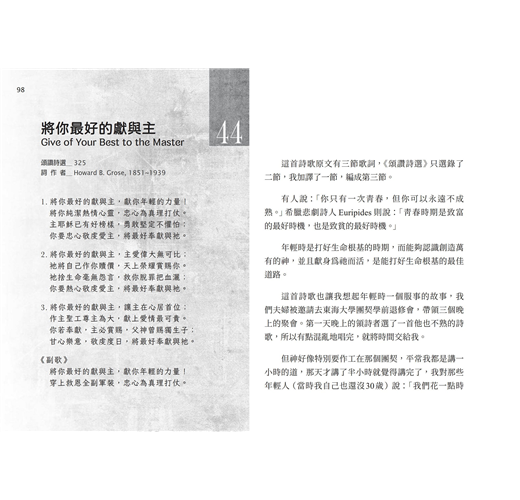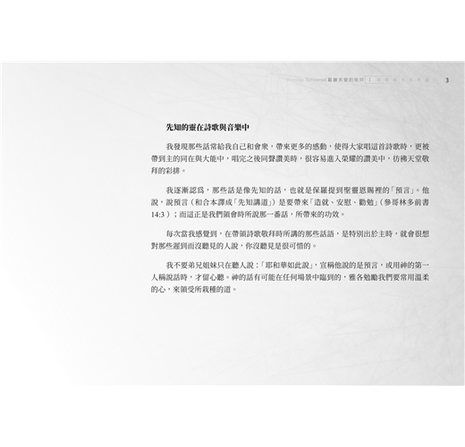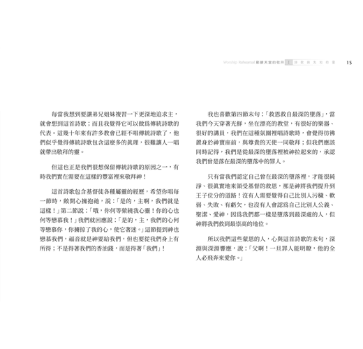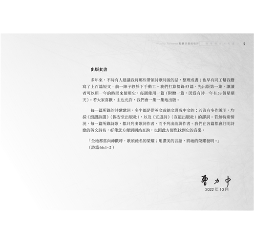 多年來,不時有人建議我將那些帶領詩歌時說的話,整理成書;也早有同工幫我謄寫了上百篇短文,前一陣子終於下手動工。我們打算摘錄53篇,先出版第一集,讓讀者可以用一年的時間來使用它,每週使用一篇(附贈一篇,因為有時一年有53個星期天)。若大家喜歡,主也允許,我們會一集一集地出版。