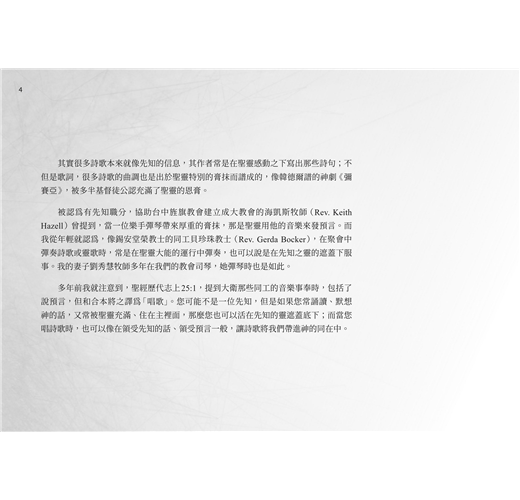 多年前我就注意到,聖經歷代志上25:1,提到大衛那些同工的音樂事奉時,包括了說預言,但和合本將之譯為「唱歌」。您可能不是一位先知,但是如果您常誦讀、默想神的話,又常被聖靈充滿、住在主裡面,那麼您也可以活在先知的靈遮蓋底下;而當您唱詩歌時,也可以像在領受先知的話、領受預言一般,讓詩歌將我們帶進神的同在中。