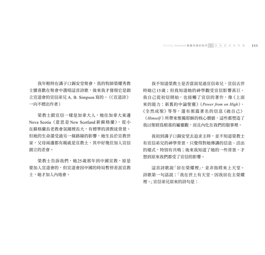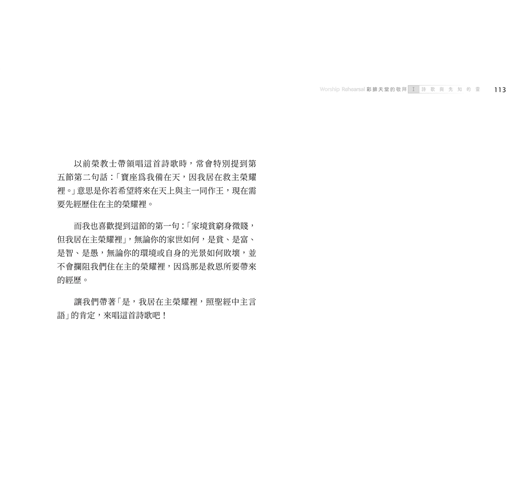 我發現那些話常給我自己和會眾,帶來更多的感動,使得大家唱這首詩歌時,更被帶到主的同在與大能中,唱完之後同聲讚美時,很容易進入榮耀的讚美中,彷彿天堂敬拜的彩排。