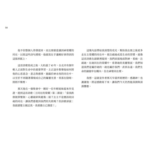 那天他在一個聚會中,剛好一位年輕姐妹起來作見證,提到這首詩歌〈主同在的榮耀〉第二節說:「當我跌倒被罪壓制,心靈破碎與憂傷;接下去主不是應該收回祂的同在,讓我們感覺到我們的失敗嗎?但詩歌卻說:我就感覺主親近我,我重擔主已擔當!」