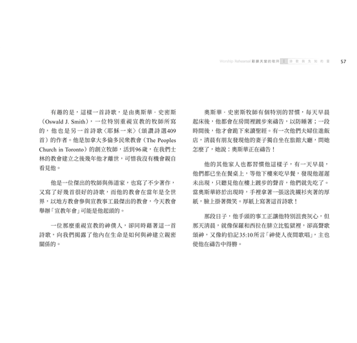 有趣的是,這樣一首詩歌,是由奧斯華.史密斯(Oswald J. Smith),一位特別重視宣教的牧師所寫的,他也是另一首詩歌〈耶穌一來〉(頌讚詩選409首)的作者。他是加拿大多倫多民眾教會(The Peoples Church in Toronto)的創立牧師,活到96歲,在我們士林的教會建立之後幾年他才離世,可惜我沒有機會親自看見他。