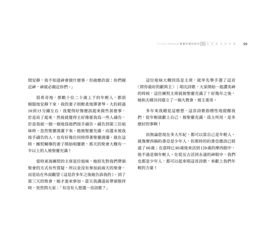多年來,每個主日當我站到台上,要帶領第一首詩歌時,常有一些神的思想浮現;或是當我幾天前預備詩歌時,或是聚會開始前我在心裡走一遍流程時,也可能是已經上台帶領詩歌時,這些話才臨到我。我通常都讓會眾先唱一遍那首詩歌,好熟悉它的曲調與歌詞,期待再唱一遍時,大家會更進入詩歌的意境中;而在唱兩遍之間,我會將浮現在我心裡的話語跟會眾分享。