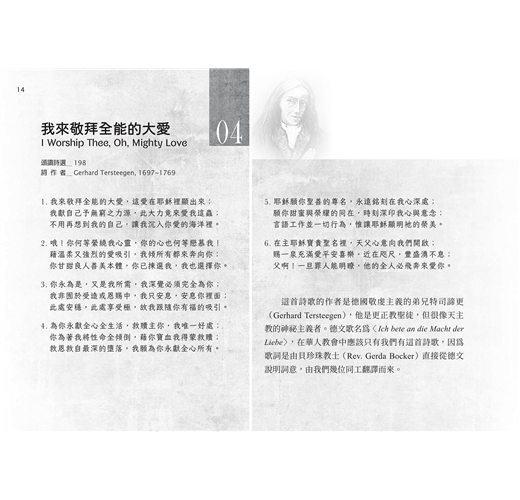 這首詩歌的作者是德國敬虔主義的弟兄特司諦更(Gerhard Tersteegen),他是更正教聖徒,但很像天主教的神祕主義者。德文歌名為〈Ich bete an die Macht der Liebe〉,在華人教會中應該只有我們有這首詩歌,因為歌詞是由貝珍珠教士(Rev. Gerda Bocker)直接從德文說明詞意,由我們幾位同工翻譯而來。