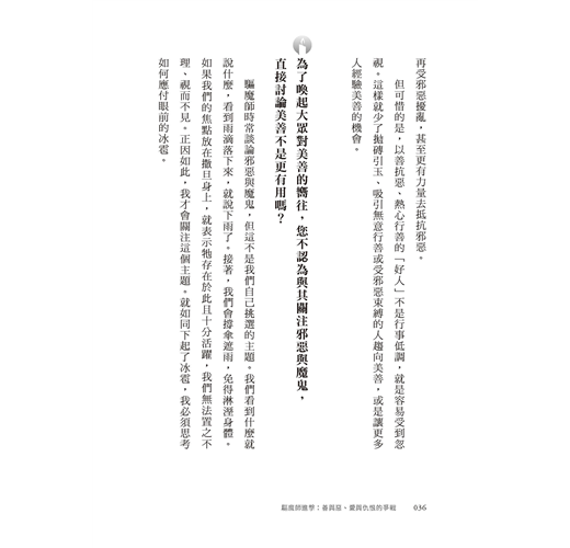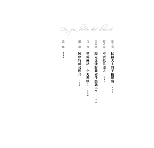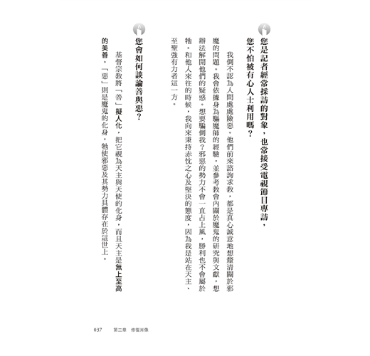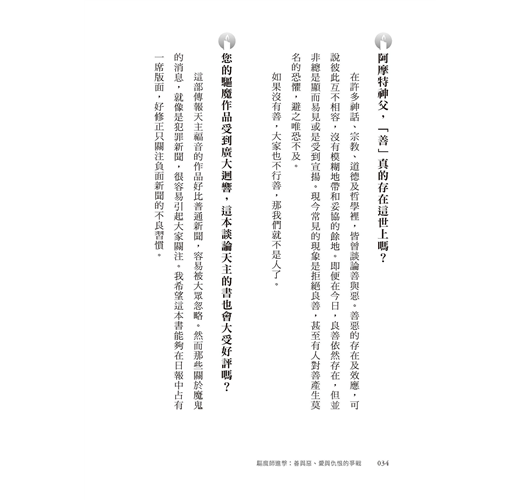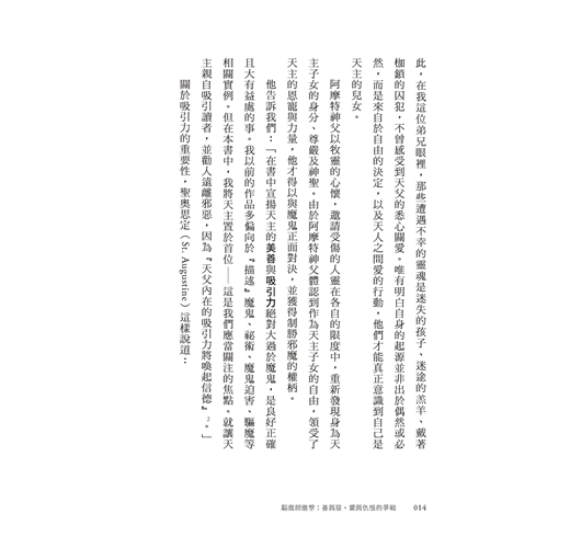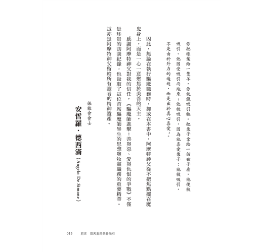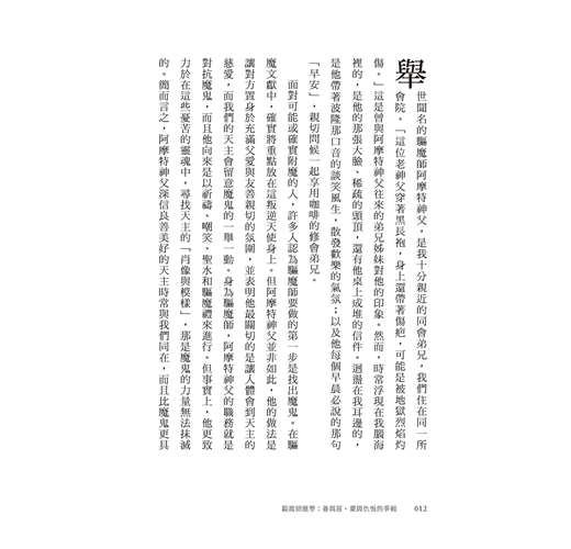 「本書以訪談方式探討關乎人生的重要問題,諸如:宗教信仰對人有何益處?善真的存在嗎?為何這世界充滿邪惡?成為驅魔師要具備什麼條件?魔鬼最後的下場如何?這些主題可待讀者一窺究竟,從中洞悉舉世聞名的驅魔師阿摩特神父的思想要旨。」──吳伯仁神父(耶穌會士、神恩復興台灣共融服務團隊指導神師)