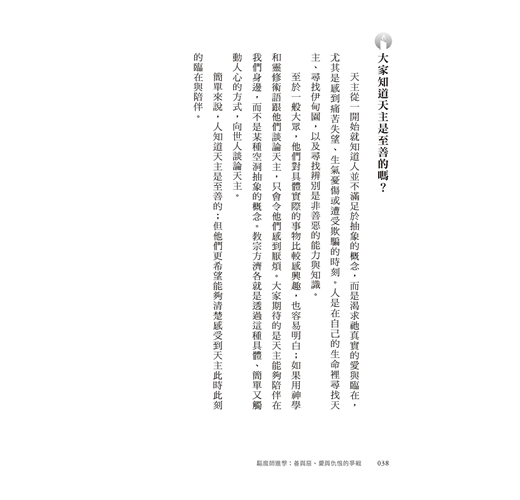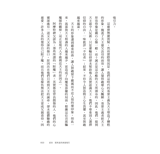 ◆ 幫助基督徒深刻體認天主的慈愛與美善,重新點燃信仰熱火,建立穩固的靈修生活,奠定良好信仰基礎,不怕風吹雨淋或暴風侵襲。適合青年會、慕道班、讀書會等成長團體共讀討論;為教友靈修、神父、神師、靈修指導者深具啟發意義。
