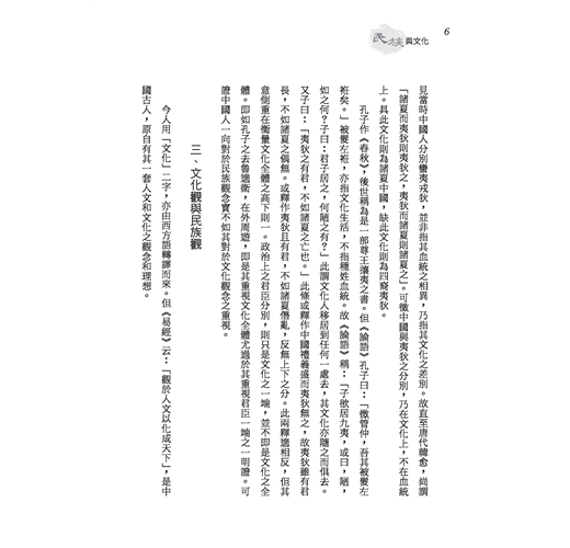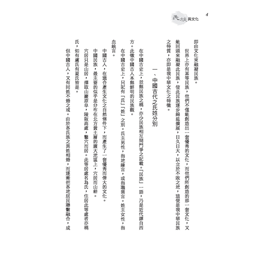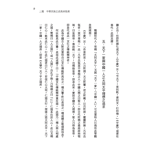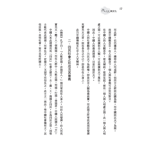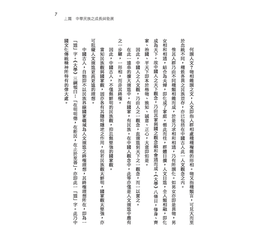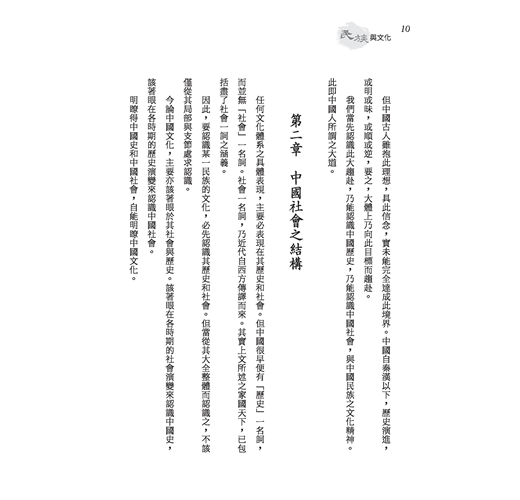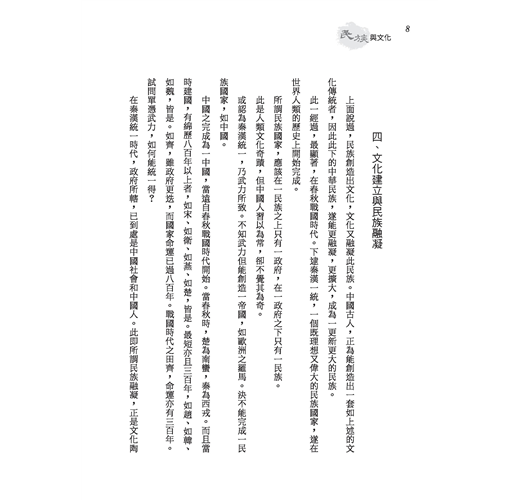 「民族」與「文化」兩名詞,乃近代國人所傳譯之西方語,但在中國上古實早已有之,民族乃中國所謂之「血統」,文化乃中國所謂之「道統」。由此民族創造此文化,但非此文化,亦無由完成民族。中國人主張文化之意義與價值實更高於民族。本書內分講義與講演詞之兩部分,書中涵義宏深,有仍值今我國人重讀研討之價值。