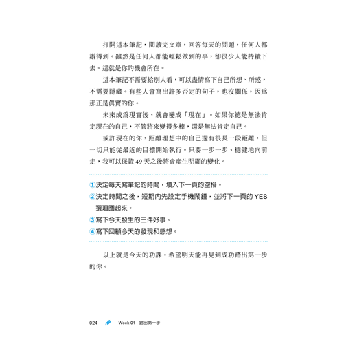 ◎每天雖然只是一小步,但持續不間斷地寫,49天之後變得超愛自己。寫這本筆記讓我覺得不孤單,彷彿有人每天為我加油,陪著我走過49天。原本以為自己無法持續,最後還是順利寫完了,是非常好的練習。(高月圭子/住宅規畫師)