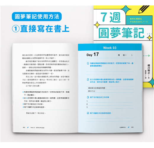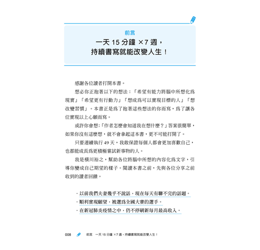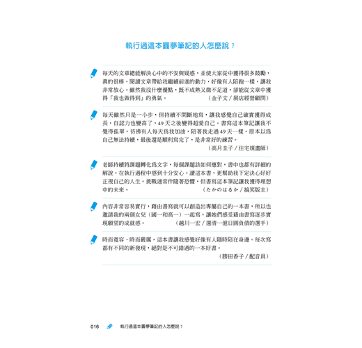 ◎書裡明白指出「想實現所有願望是不可能的」,讓我覺得這本書很值得信任,因此決定嘗試寫寫看。每天的功課都清楚列出各種學習內容,讓我從中獲得許多新發現。相信每一位購買本書、實踐本書的人都會非常幸福。(石川與生/Best Body推拿師)