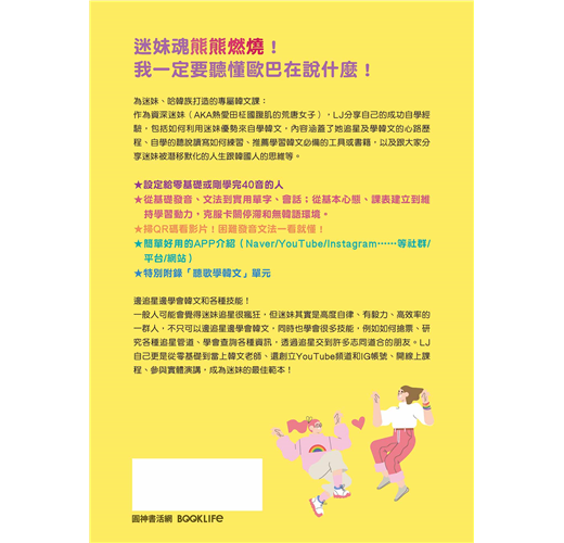 「LJ雖然沒有一丁點韓國血統,韓文卻講得如此有魅力,教學法更是深入淺出。迷妹迷弟你們看這本書會學得非常快樂!」──快樂寶賤(韓文文化YouTuber)