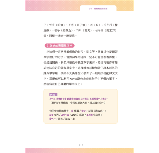 迷妹最常學韓文的管道就是看偶像上的綜藝節目、MV 的幕後花絮等,所以聽力往往是進步最快的,然而想要有系統的組織語言,直接用自己的嘴巴說出來,那還真的不容易!書中也有許多方法可以讓迷妹勇敢開口說韓文,推薦大家一定要看 LJ 的發音影片學習,因為她對發音真的是自我要求到一個變態的地步,不知道的人還以為她是韓國地鐵站的廣播配音員(浮誇)。
