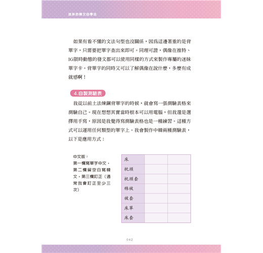 其實寫這本書的時候是充滿很多挑戰的,畢竟本書方向是設定給零基礎或剛學完 40 音的人看的,因此在寫書的過程當中我一直很苦惱怎麼樣的方向才會對大家有所幫助。在這本書中,我將自己的自學經驗分享給大家,內容涵蓋了我追星及學韓文的心路歷程、自學的聽說讀寫如何練習、推薦學習韓文必備的工具或書籍,以及跟大家分享迷妹被潛移默化的人生跟韓國人的思維等。我不敢說這是一本多麼專業的書籍,但如果你也是迷妹,因為想聽懂偶像而學韓文、卻不知道從何下手,希望這本書會讓你有所收穫。