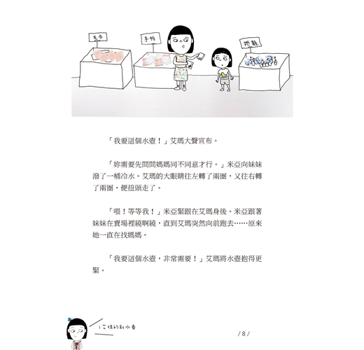 「妳需要先問問媽媽同不同意才行。」米亞向妹妹潑了一桶冷水。艾瑪的大眼睛往左轉了兩圈,又往右轉了兩圈,便扭頭走了。