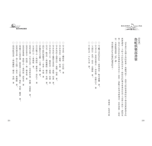 我一定得告訴你的是,讀這本書的過程真是一段太有趣的探險。……書裡的主角在以圍繞「魯蛇俱樂部」開始探索新生活的同時,也穿梭在一本又一本的故事書裡,體驗各種情節。而作為讀者的我,像是也跟著在一個又一個真真假假的宇宙裡來來回回。