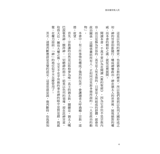 ★ 撒母耳記的作者具有超人的政治智慧,是偉大的政治詮釋者,看透一切的政治操作,更是超越時代的先驅政治理論先驅。本書內容廣博,分析精闢深刻,有非常多獨特又原創的見解。《上帝的陰影》作者Michael Walzer