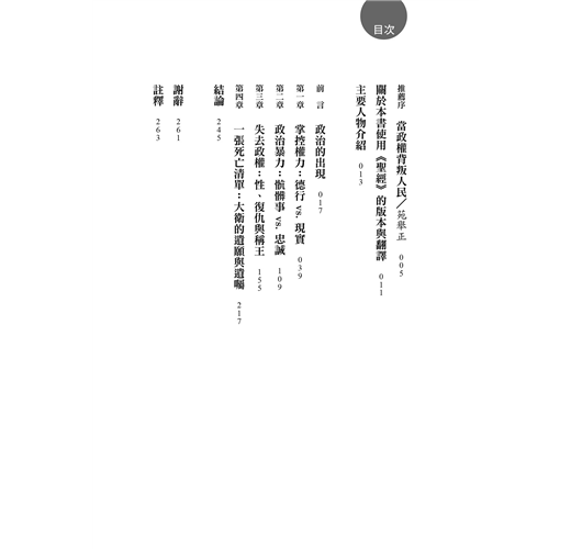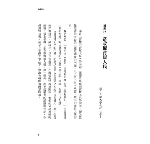 本書首度從「政治權力」的角度來解析〈撒母耳記〉這部人類經典當中令人駭異的故事情節與角色互動,賦予讀者前所未有的清晰角度,可以去思考、理解政治。