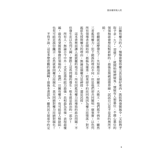 ★ 作者藉由討論撒母耳記中所記載的從神治到人治的王權轉移故事,讓我們能夠理解人類自由選擇下所需承擔的各種後果,也讓我們得以反思現代政治中面對權力所需抱持的正確態度。阿和╱漫遊以色列版主