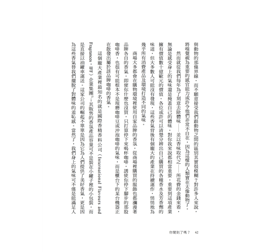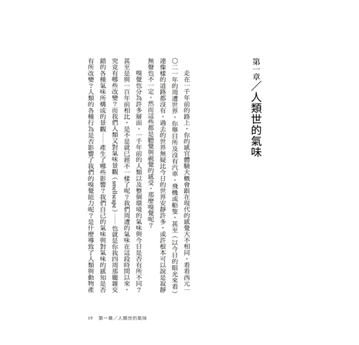 「作者試圖破除一些迷思,例如鳥類其實沒什麼嗅覺能力這事,原來純粹是基於早期偏頗的觀察……也探討了我們如何能夠利用嗅覺來造福人群,讓我們不僅耳聰目明地探索這個多姿多彩的世界,也能在芬芳馥郁、沁人心脾的環境中怡然自得、心曠神怡。」