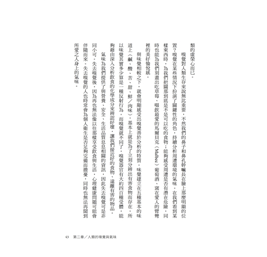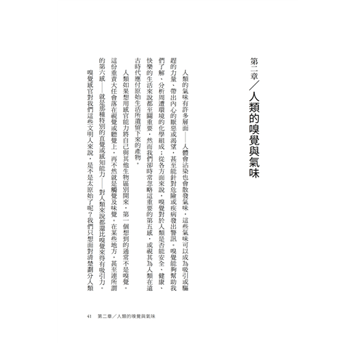 但人類實在太依賴視覺,以至於常常忽略了其他感官能力的存在──尤其是嗅覺!我們可能會誤以為人類不像其他物種那麼依賴嗅覺,然而如果你曾為遮掩體味而煩惱,或是曾遭受嗅覺喪失之苦(也許是感染Covid-19),就會確信嗅覺在我們生命中的許多重要層面依然扮演著關鍵角色。
