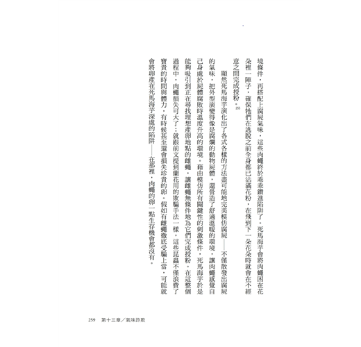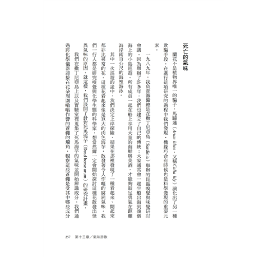 世界上有許多種花其實是最狡猾的騙子,它們會利用氣味讓昆蟲上當──欺騙性授粉的機制讓昆蟲白白浪費力氣,而好處都讓這些花拿去了。在一七○○年代末,德國自然學家克里斯欽.康拉德.斯普任格(Christian Konrad Sprengel)就已發現蘭花會欺騙昆蟲為其授粉,卻絲毫不給予回報。查爾斯.達爾文(Charles Darwin)則在一八○○年代中期繼續進行這項研究,深入探討昆蟲受植物欺騙而為其授粉,卻沒有得到回報的現象。我也做了好幾個欺騙性授粉機制相關的研究,每一次我都跟斯普任格和達爾文一樣,為這些生物迂迴曲折的欺騙手法大感驚嘆。