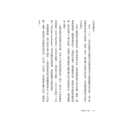 「讀了本書,我們才明白,原來世界上各種氣味的存在,關係著各種生物的存續。如果聞不到某些味道,或是錯誤解讀某些氣味(比如無處不在的塑膠製品),許多生物很可能找不到食物,甚至難以尋覓伴侶。嗅覺的影響如此巨大,人類實在不能再把自己當作上帝,任意改變或泯滅大自然的氣味。而且,愈被人工合成的氣味包圍,對天然氣味的敏感度愈低,各種嗅覺喪失所預告的疾病,像是阿茲海默症,就會埋伏在健康崩壞的路上。這本書帶來的不僅是知識,更敲打著我們的良心,必會激盪出更多守護地球的行動力。」