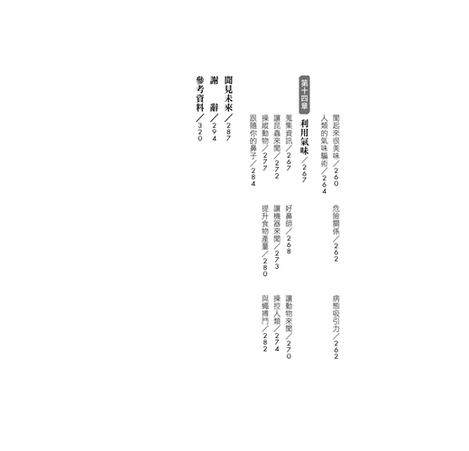 我們人類也時常利用生物對某些氣味的偏好來滿足自己的需求。在接下來的第十四章,我會帶大家了解人類運用氣味訊號的方式,也會談到運用昆蟲費洛蒙的各種策略。舉例來說,我們會為了保護農作物而運用昆蟲費洛蒙。此外我也會解說幾個更直接運用氣味操縱其他生物的方式。