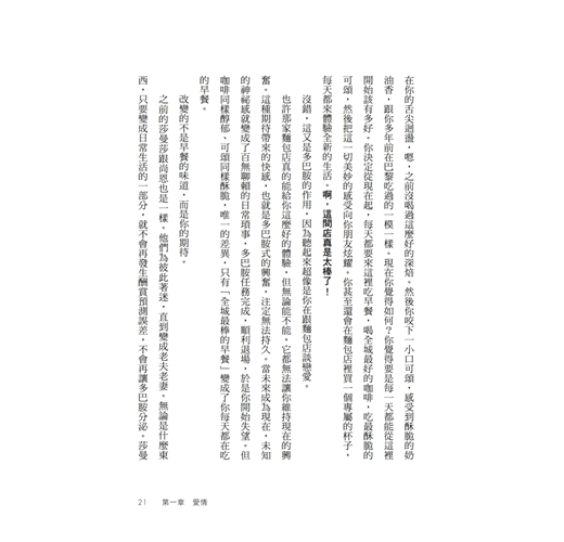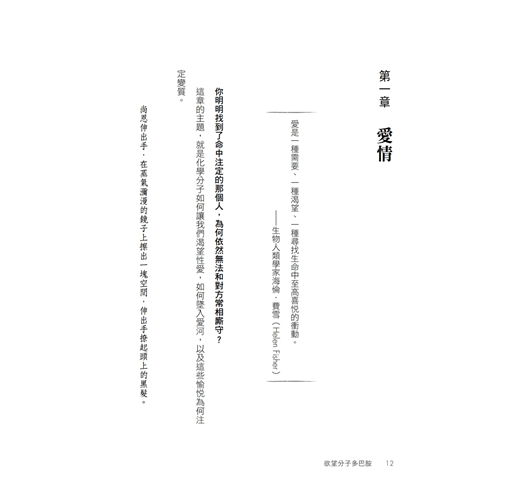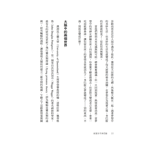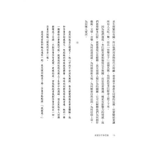 ▍第一章 愛情(節錄) /真愛長存的祕訣/ 問題是,多巴胺不太在乎你當下擁有什麼,只在乎你未來還能再拿多少。如果你住在橋下,多巴胺會叫你去搞一座帳篷;如果你住在帳篷裡,多巴胺會叫你去買棟房子;如果你住在全球最貴的豪宅,多巴胺會叫你去月亮上蓋城堡。大腦裡的多巴胺迴路根本不知道什麼叫「好」,也不在乎什麼叫「夠」,它唯一會做的事,就是讓剛遇見的全新未來在你眼中耀眼奪目,遮蔽你當下擁有的完美幸福。對多巴胺而言,沒有最多,只有更多。 多巴胺是愛情火花的源泉,是天雷地火的爆點之一。但要在火花引爆之後維繫愛情,愛的本質就必須改變。因為之後的愛情不再來自單一的多巴胺,而是來自一整組化學交響樂;而且多巴胺其實並不是「快樂分子」,而是「期望分子」。要真正享受當下,要從未來進入現在,我們大腦就必須習慣多巴胺的離開,轉而跟血清素(serotonin)、催產素、腦內啡(endorphins,大腦自己分泌的嗎啡類物質),以及一系列的內源性大麻素(endocannabinoids,大腦自己分泌的大麻類物質)好好相處。這些分子就是很多人可能都聽過的「當下分子」(Here and Now molecules, H&Ns),多巴胺讓期待變得刺激,而當下分子則讓我們享受手中擁有的體驗與快樂。其中一種內源性大麻素的名字anandamide甚至就來自梵語的「阿難陀」,意思是喜悅、極樂、欣喜。 照人類學家海倫.費雪的說法,初期的愛情,或者說激情,都只能維持十二至十八個月。在那之後能夠繼續相處的,都發展出了另一種「伴侶之愛」(companionate love)。這種愛情來自此時此刻的體驗,它背後的化學分子就是「當下分子」,這些分子讓我們因為跟相愛的人在一起,而感到幸福。 「伴侶之愛」不是人類的專利,那些終身相守的動物也有一樣的現象。這些動物的共同特徵,就是會共同築巢、共同防禦領地。牠們會彼此餵食、互相梳毛、共同育幼。最重要的是,這些動物一旦分開就會陷入焦慮,恨不得每秒都黏在一起。人類也是這樣,我們會照顧小孩、守護家園,而且會因為與另一半的生命緊密交織而深深滿足。 當愛情進入第二階段,「當下分子」就控制了局面,並且抑制了多巴胺。因為多巴胺會在我們的腦海中描繪一幅美好未來,讓我們奮不顧身地爭取。而要爭取未來,要開展一段新關係,勢必就得不滿於現況。但「當下分子」主導的「伴侶之愛」完全相反,至少它在伴侶關係上會讓我們深深滿足於當下的現況,拒絕任何改變。所以雖然多巴胺迴路和「當下分子」迴路可以同時運作,但其實經常彼此拮抗。「當下分子」迴路一旦啟動,我們就會想去體驗身邊的真實生活,抑制多巴胺的作用;反之,多巴胺迴路一旦啟動,我們就會想去探索未來,抑制當下分子的功能。 實驗結果也確實如此。科學家發現,熱戀者血液細胞中的血清素受器濃度比「健康」的人更低,表示血清素這種「當下分子」的力量正在減少。 要拒絕新伴侶,拒絕多巴胺的興奮與激情確實很難,但能夠做到這點才能成熟,也才能邁向長遠的幸福。這樣說吧,假設你是一個多巴胺主導的人,為了去羅馬度假,花了好幾週仔細安排行程,把你聽過的每個博物館與重要景點都列了上去。但當計畫實現了,終於親眼看到米開朗基羅的真跡,你卻無心欣賞,滿腦子只想著下一站要怎麼去事先訂好的餐廳。你知道眼前的東西是史上最美麗的藝術品,但你滿腦子多巴胺,只想著規畫與未來,看不到當下的現在。愛情也是一樣,最初的激情來自多巴胺,讓我們興奮、好奇、情人眼裡出西施、不斷設想彼此的未來;但在那之後,我們就會發現理想跟現實之間有巨大落差,然後進入伴侶之愛,把自己交給「當下分子」,平靜地享受身邊的各種體驗與心情。 來自多巴胺的浪漫愛情,就像一次緊張刺激的雲霄飛車,但它稍縱即逝,必須換成另外一群化學物質才能轉向伴侶之愛。多巴胺讓我們執著於追求,催產素和血管加壓素(vasopressin)則讓我們走入長期關係,女性體內較活躍的是催產素,男性則是血管加壓素。 科學家在實驗室中,用好幾種動物來研究神經傳導物質的作用。例如雌性草原田鼠(prairie vole)的腦中一旦注入催產素,就會和附近看到的任何雄鼠進入穩定的長期關係。雄性草原田鼠也是,一旦獲得大量分泌血管加壓素的基因,就會放下原本濫交的天性,只跟一隻雌鼠交配,無視身邊的其他雌鼠。看來血管加壓素就像某種「好老公激素」。多巴胺的功能則剛好相反,擁有大量分泌多巴胺基因的人,性伴侶人數最多,第一次性行為的年齡也最低。 由於大部分的長期伴侶,都已經從多巴胺式的激情轉為「當下分子」式的愛情,他們的做愛頻率較低。這還滿合理的,因為催產素和血管加壓素會抑制睪固酮(testosterone)分泌。同樣地,睪固酮也會抑制催產素和血管加壓素的分泌,也許就是因為這樣,血中睪固酮濃度本來就比較高的男性,通常更少結婚。此外,單身男性的睪固酮濃度高於已婚男性;而且男性的婚姻一旦開始動盪,血管加壓素的濃度就會下降,睪固酮濃度上升。 所以人類到底需不需要長期的伴侶關係?很多證據導出的答案都是肯定的。周旋在好幾位性伴侶之間的生活似乎很誘人,但大部分人最後還是會定下來。聯合國的一項調查顯示,九○%以上的男性和女性都在四十九歲之前結婚。即使沒有伴侶之愛,我們當然也能活下去;但大部分的人都會花費多年的時間精力,尋找一段能夠長相廝守的關