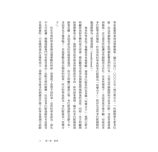 ▍第一章 愛情(節錄) /真愛長存的祕訣/ 問題是,多巴胺不太在乎你當下擁有什麼,只在乎你未來還能再拿多少。如果你住在橋下,多巴胺會叫你去搞一座帳篷;如果你住在帳篷裡,多巴胺會叫你去買棟房子;如果你住在全球最貴的豪宅,多巴胺會叫你去月亮上蓋城堡。大腦裡的多巴胺迴路根本不知道什麼叫「好」,也不在乎什麼叫「夠」,它唯一會做的事,就是讓剛遇見的全新未來在你眼中耀眼奪目,遮蔽你當下擁有的完美幸福。對多巴胺而言,沒有最多,只有更多。 多巴胺是愛情火花的源泉,是天雷地火的爆點之一。但要在火花引爆之後維繫...