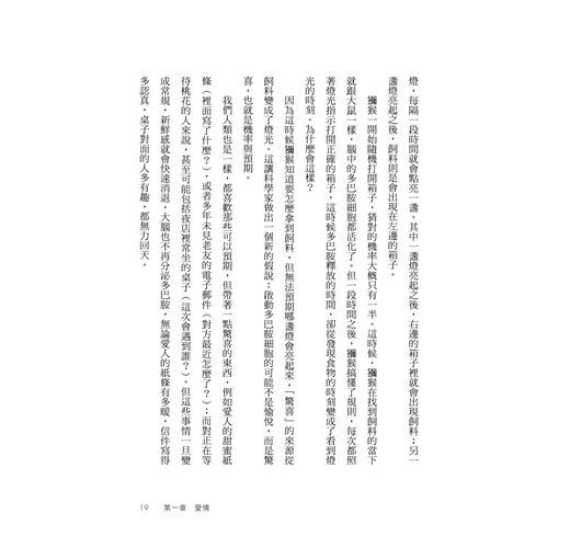 謝辭 引言 低頭向下,抬頭向上 第一章 愛情 什麼比快樂更強大? 猴子跟老鼠告訴你為什麼愛情會褪色 大腦中的兩個世界 魅惑的魔咒 多巴胺的黑暗面 什麼是滿足? 真愛長存的祕訣 睪固酮:活在當下、享受性愛 陪著我的時候想著他 為什麼媽媽叫你婚前不要給? 第二章 精神性藥物 大腦究竟是誰控制的? 求生的機制 多巴胺的幻象世界 想要VS.喜歡 當欲望迴路被綁架 就連洗衣服,都讓你想吸毒 快克為什麼比古柯鹼更爽? 喝醉跟喝嗨一樣嗎? 毒癮永不止息 欲望縈繞不去,快樂稍縱即逝 衝動與惡性循環 帕金森患者...