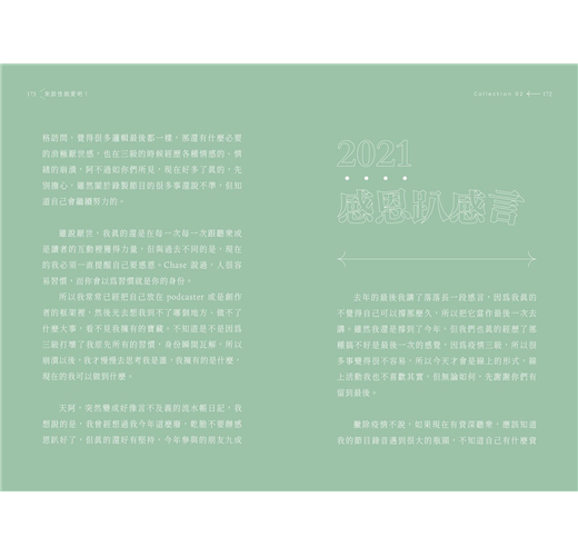 2019年Firstory 剛開始,四月還是五月的某一天我滑著 Spotify的排行搒,看到這個封面精心設計 Jingle 又好聽的節目,那時候才一集,讓我第一次對 Podcast著迷,明明還不認識,但彷彿已經在耳朵以及腦海中勾勒我們聊天的樣子,完全沒想到三年後的現在在電腦前面抓破腦袋寫這個推薦序。我的工作時常與需要與創作者聊天,聊他們的近況、分享我們公司(我們公司是一個專門服務 Podcaster 的公司)的計畫。所以我有幸認識好多厲害的創作者,有些聊到甚至變成好朋友。揚認識我們全公司的夥伴,早期常常來串門子分享她最近的好事爛事,工作雖忙,但總是享受聽她荒謬的人生哈哈哈!