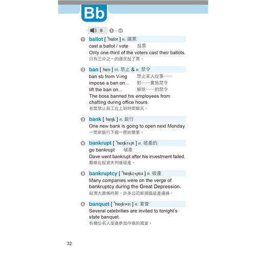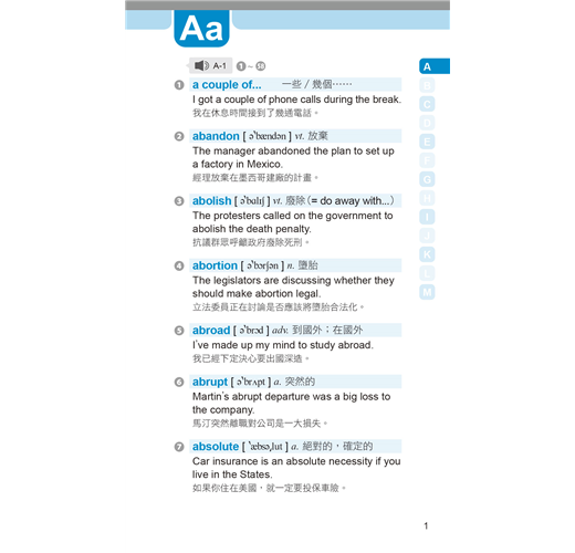 單字、例句皆搭配專業外籍老師朗讀音檔,打開耳朵跟著朗誦就能快速熟習多益單字。