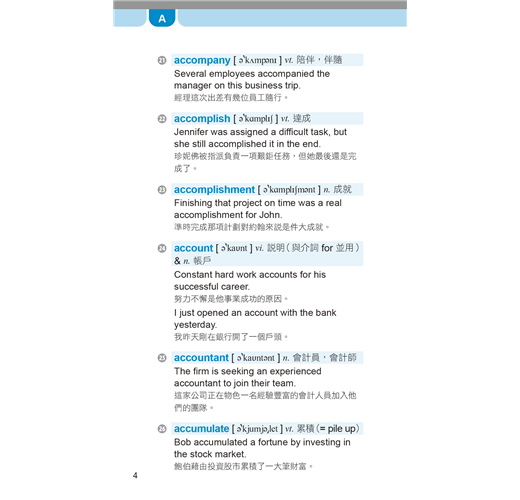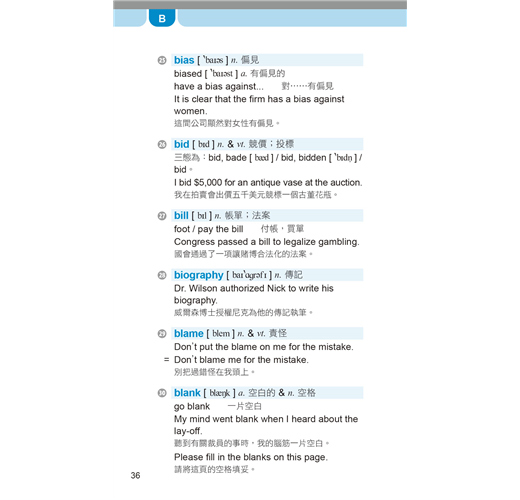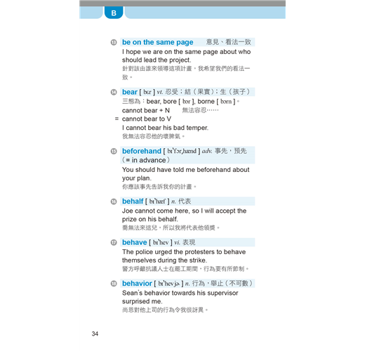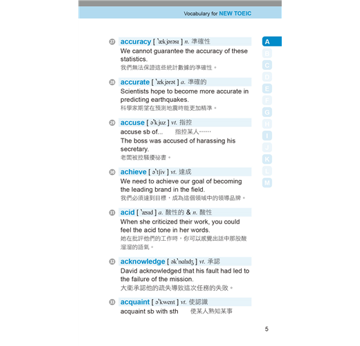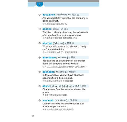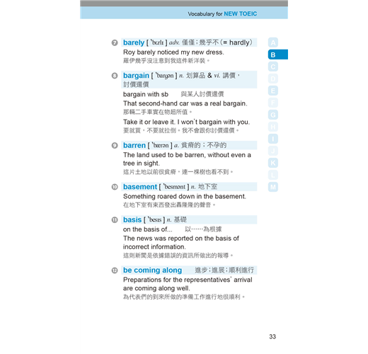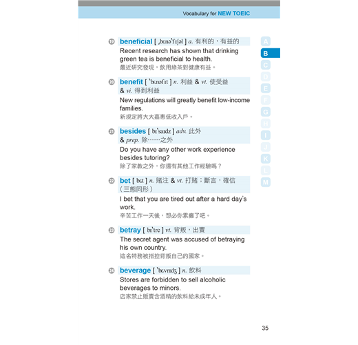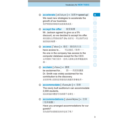 收錄多益測驗必備單字、片語及用法,並列出音標、詞性、字義、商用實境相關例句及翻譯。