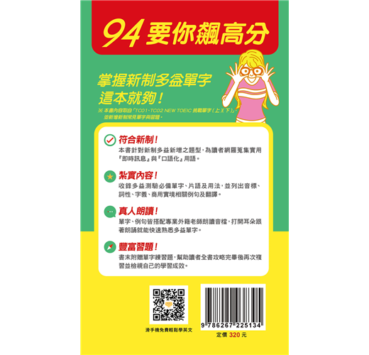 秉持著賴世雄教授「善用零星時間學好英文」的精神,整合收錄新制多益重點單字,小小一本,讓您輕鬆「袋」著走。收錄專業外籍老師朗讀單音檔QR Code,隨掃隨聽,跟著一起朗誦就能快速提升字彙量,黃金證書輕鬆GET!