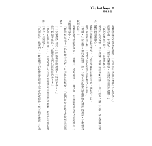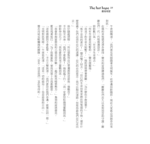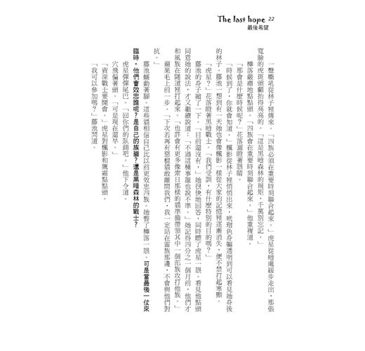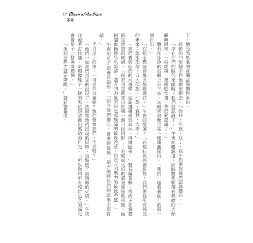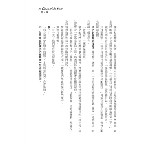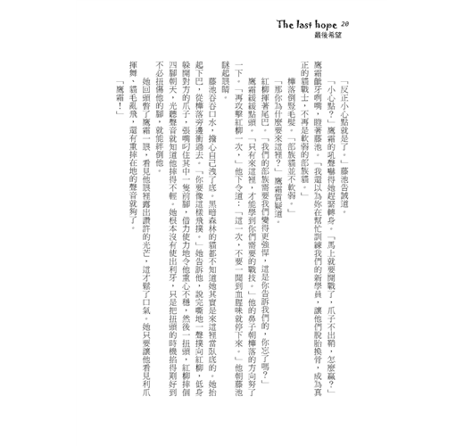 「我們看到你們的大遷移,從湖邊遷移到森林,再遷回來。」磐石偏著頭,彷佛正在看貓群從他眼前經過。「所有預言都來自於第一個日出倒影──毛髮如火焰的貓兒會拯救四大部族,而銀貓會拯救急水部落,還有四力量不只是部族貓的最後希望,也是光明勢力的最後希望。」