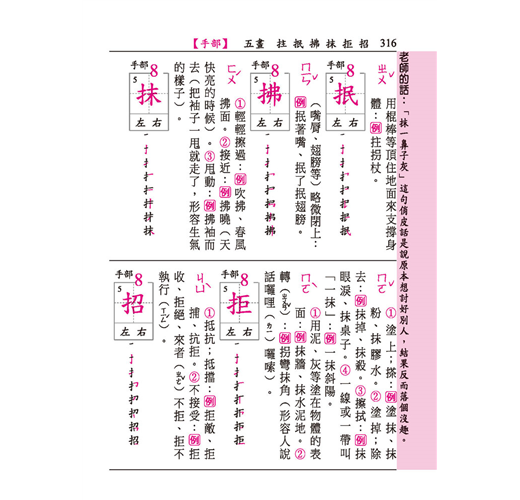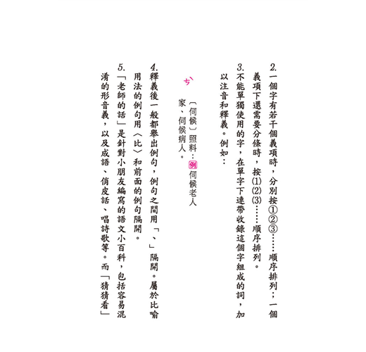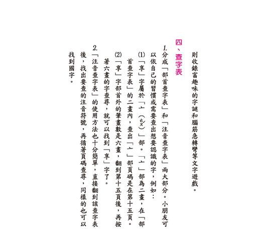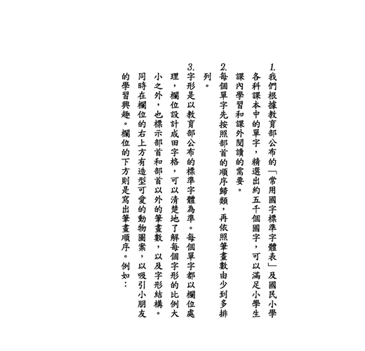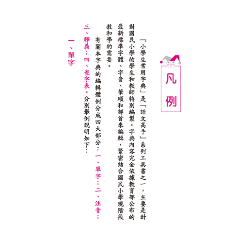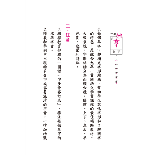 本字典收錄約五千個國字,全書都依據教育部頒布的「常用國字標準字體表」和「一字多音審訂表」編輯,並補充標準筆順和「字形結構」。其中「字形結構」不僅可以幫助小朋友記憶字形和了解國字的特色,也是配合108課綱國小國語文學習課程的最佳輔助教材。而「老師的話」和「猜猜看」單元可以幫助小朋友輕輕鬆鬆提高國語文程度。此外,書中的破音字和容易讀錯的字,都一一標示注音,是一本十分適合小朋友使用的字典。