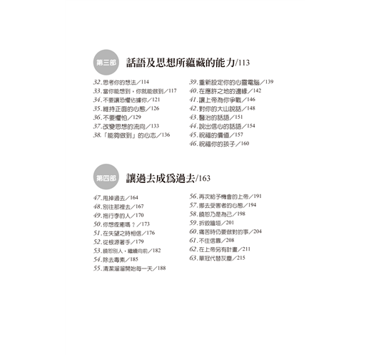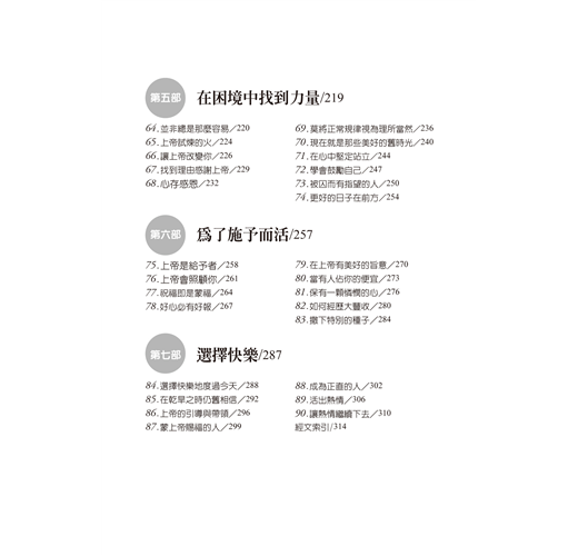 花時間慢慢地細讀每個篇章。這本書並不需要你一鼓作氣地讀完,或是花幾天密集閉門練功。我期許這本書能以三個月的時間,讓你對生命有新的看見,使你從此不再一樣。花九十天,每天讀一章。在一天當中,好好思想所讀之文章要傳達的主要意涵,並藉此啟發你,去發現上帝更多在你生命中所預備的美好。好好查考每章所附的經文,因為這些經文通常是和書中所討論的聖經原則有直接的關聯,而這些經文也會提供你所需要的背景資料,讓你能更明白正在閱讀的真理。若你想從書中得到最大的幫助,就不要輕忽這些簡短的、上帝的話語。