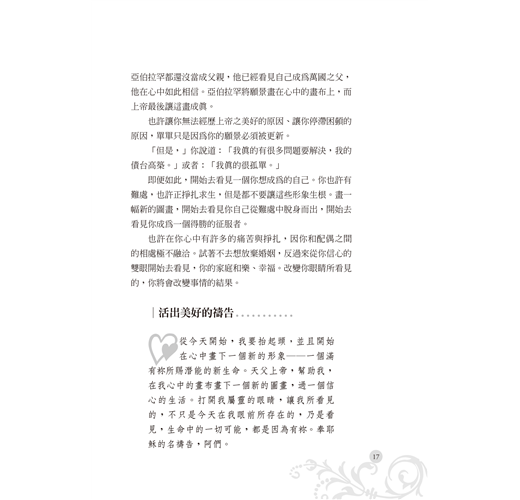 從今天開始,我要抬起頭,並且開始在心中畫下一個新的形象──一個滿有所賜潛能的新生命。天父上帝,幫助我,在我心中的畫布畫下一個新的圖畫,過一個信心的生活。