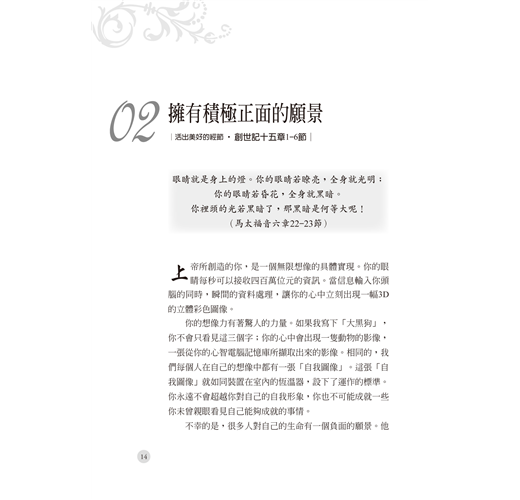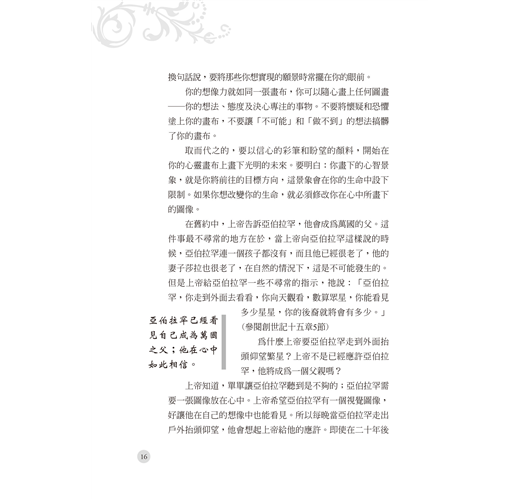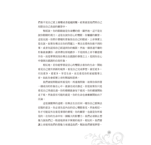 這是個簡單的道理:你無法生出任何一樣你自己都無法信服的意念。你必須先從內在的信心雙眼看見,然後相信,你才可能從外在看見事情的實現。你的願景,也就是你所看見的,在你的生命中有一個極大的影響力。我們必須制止想像力說我們已一敗塗地到束手無策的地步。相反的,我們要讓上帝使用我們的想像力來建造我們,幫助我們實現夢想。