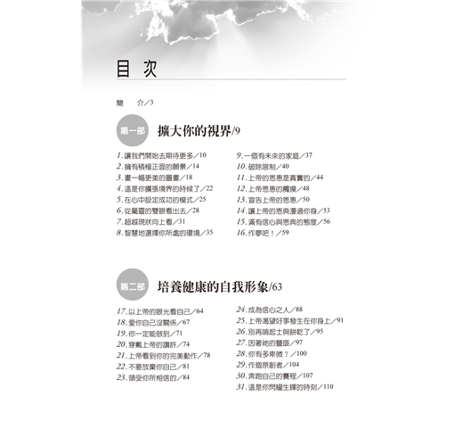 同時根據書中的主題,再配合一段相關的閱讀經文和經句(建議你將它們背誦起來)。這些安排是希望能對讀者的靈命成長有所幫助,期待書中的每個章節都能成為你屬靈的跳板,使你與主更親近,並幫助你超越那些使你無法活出美好的攔阻。在每一篇的最後並附上一段禱告,幫助你表達心中的渴望、代禱事項,以及建立與上帝活潑、新鮮的對話。當然,你本身對上帝的禱告,比我所建議的禱告要來得重要許多,所以,這個禱告只是希望成為你與上帝對話的開始,別因此而局限了你與天父之間的親密對話。