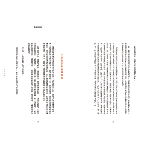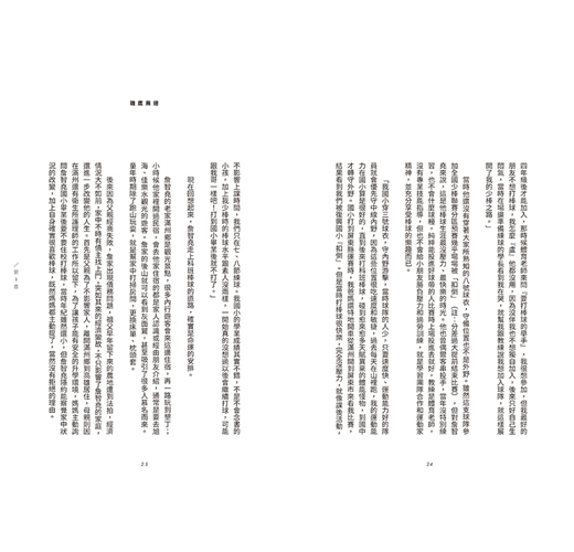 我的身材條件普通,雖然有點天分,但這種天份跟我棒球生涯遇過不計其數的天才選手相比根本不算什麼,要能在各層級的競爭下生存,需要先找到自身的小小優勢,然後盡一切努力把它發揚光大,我們不一定能當最出眾耀眼的,但絕對可以當最努力的。