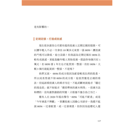 現在很多證券公司都有提供投資人定期定額的服務,可以讓年輕人不必一次拿出10萬多元來買一張0050,讓投資的門檻可以降低,這也沒錯!但我認為定期定額扣0056比較有成就感,更能鼓勵年輕人開始投資。假設你每個月扣1萬元,扣0050要1 年左右才能買到一整張,但扣0056,大概3個月就能買到一整張,不是嗎?