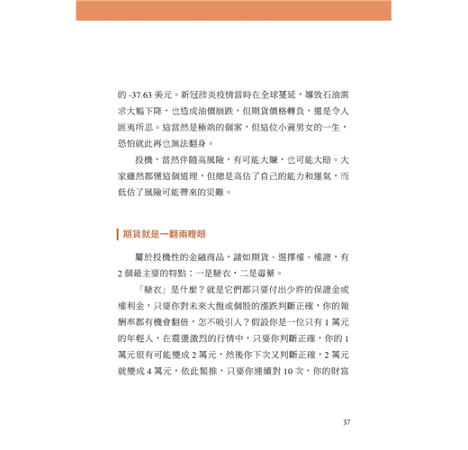 2020年有個很勁爆的投機故事:一位年輕人用0.025美元買了10口小輕原油期貨,一夜慘賠550萬元。他以為他的風險就只有0.025美元,絕對是一個本輕利重的超划算交易,沒想到期貨價格居然出現負值,而且收盤價更是誇張的-37.63美元。新冠肺炎疫情當時在全球蔓延,導致石油需求大幅下降,也造成油價崩跌,但期貨價格轉負,還是令人匪夷所思。這當然是極端的個案,但這位小資男女的一生,恐怕就此再也無法翻身。